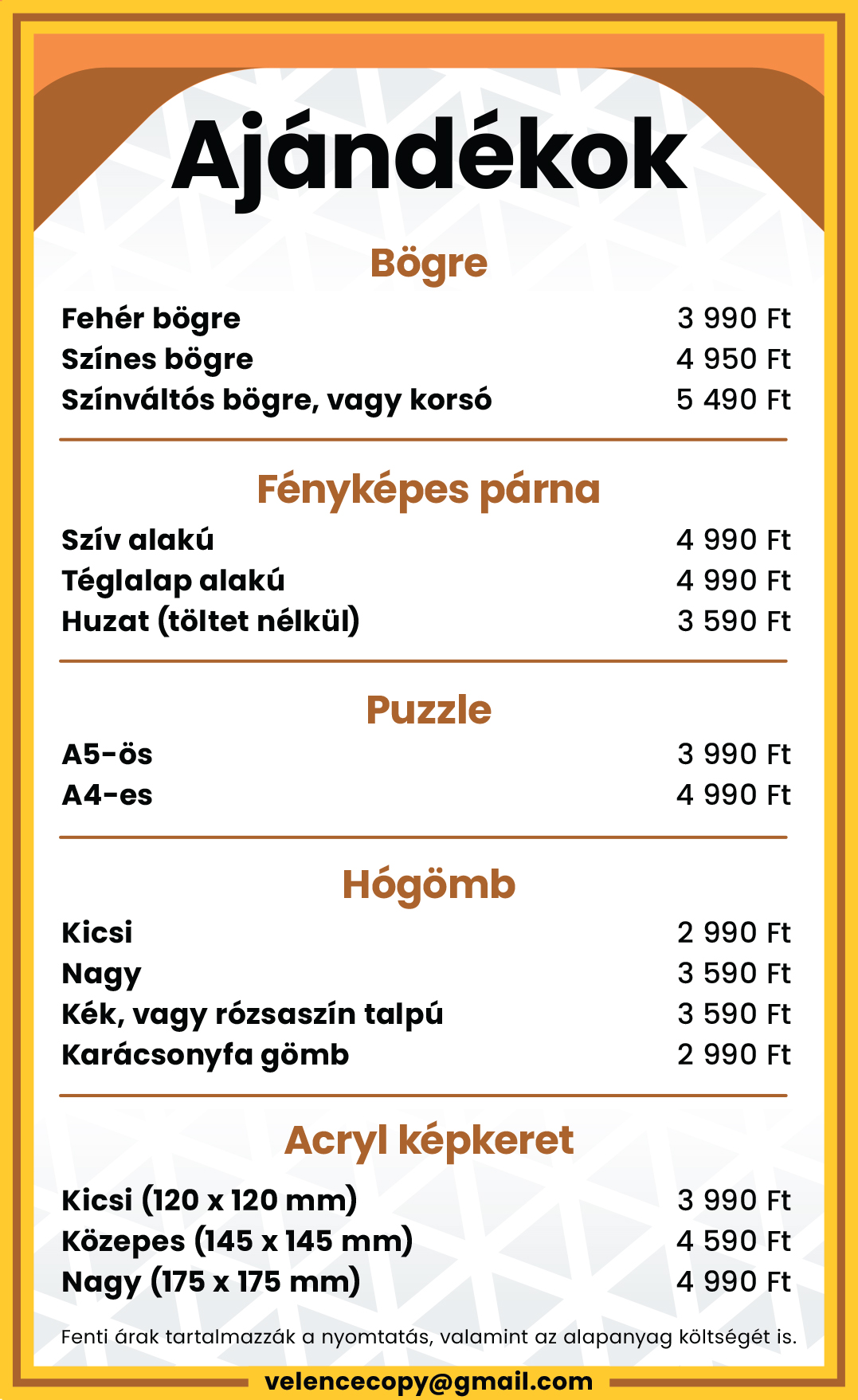 Egyedi fényképes ajándékokat készítünk, amelyekkel biztosan mosolyt csalsz bárki arcára. Bögre, puzzle, párna, kulcstartó, fotókönyv, naptár – mindet a saját fotóddal és szövegeddel személyre szabjuk. Tökéletes születésnapra, évfordulóra, karácsonyra vagy céges meglepetésnek. Ha nincs kész grafika, segítünk az elrendezésben és feliratozásban is.