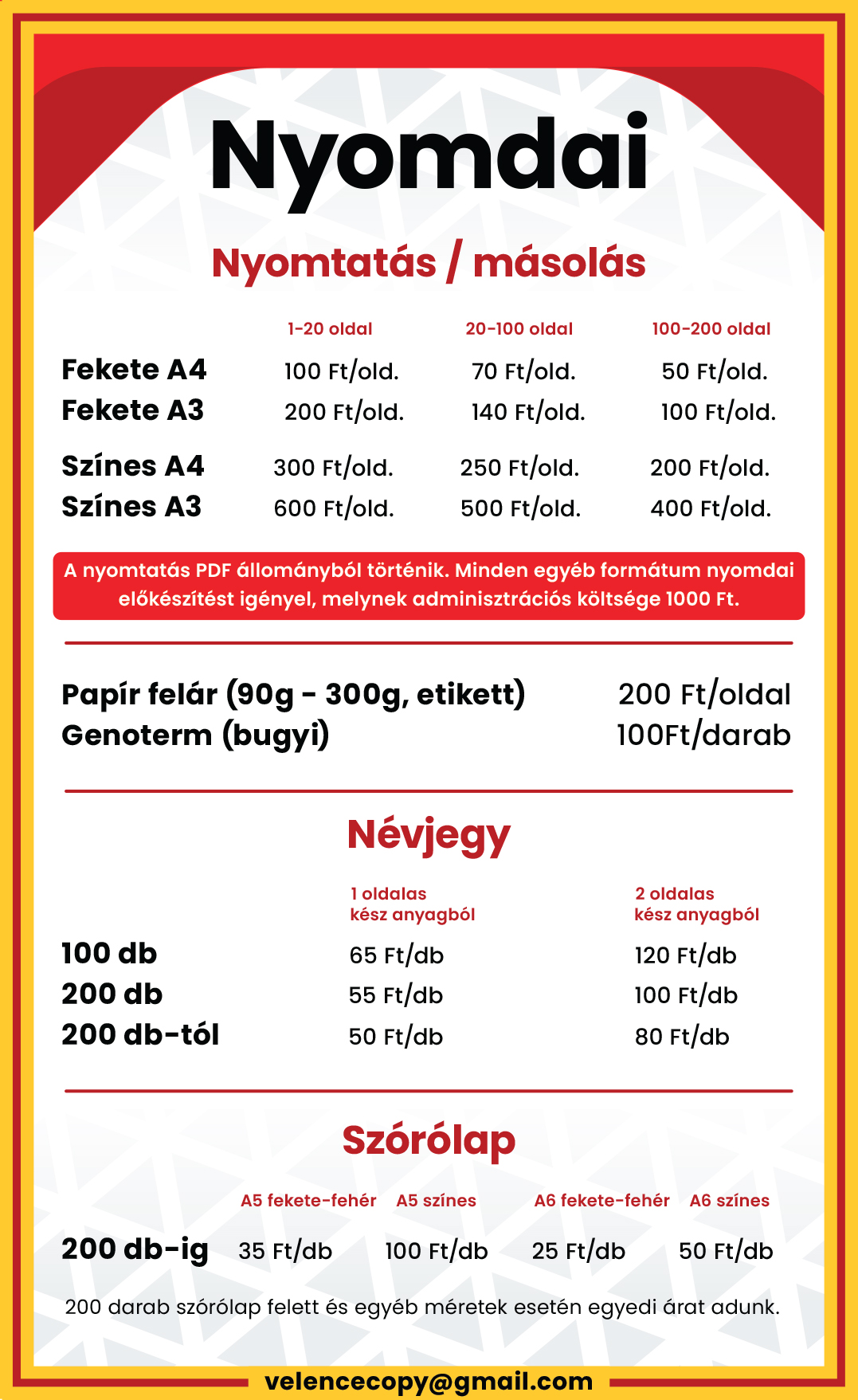 Digitális gyorsnyomdánkban kis és nagy példányszámban is vállalunk nyomtatást. Névjegykártya, szórólap, plakát, leporelló, meghívó, étlap – mindent helyben készítünk, rövid határidővel. Segítünk a fájlok beállításában, színkezelésben, papírválasztásban is, hogy a végeredmény pontosan olyan legyen, amilyet elképzeltél. Ha kell, akár aznapra is megoldjuk a sürgős munkákat.